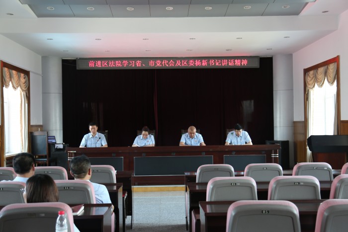近日,前进区人民法院组织召开全院大会,分别由副院长王莉、赵庆林传达、学习了省委第十二次党代会、市委第十三届二次全会、前进区委十二届二次全会精神和杨新书记的讲话,会上前进法院党组书记、院长张甲光同志对会议精神和杨新书记讲话精神重点结合法院工作作了详细的解读,并要求全院干警要深入学习领会省、市党代会及区委杨新书记精神实质,要以此次大会为契机,进一步增强学习贯彻省第十二次党代会精神的自觉性和主动性,领导干部要带头学习,要先学一步、学深学透,融会贯通,真正把思想和认识统一到省、市委和区委的重大决策部署上来。