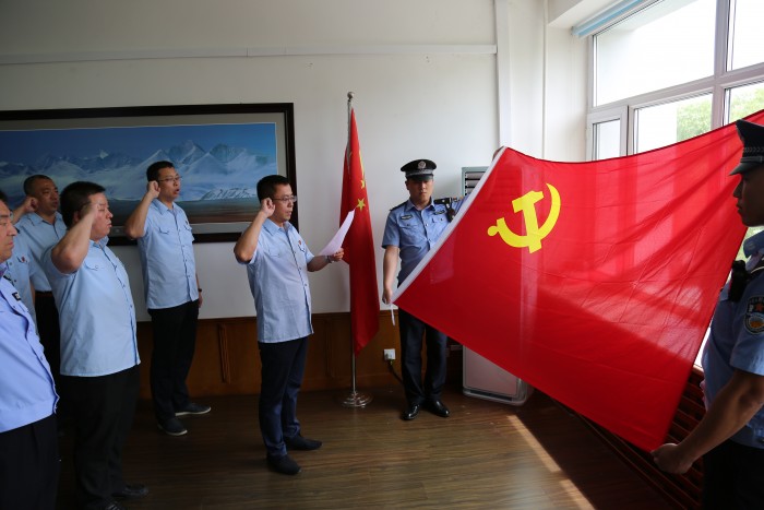 为庆祝中国共产党建党97周年,深入贯彻落实党的十九大精神,进一步引导广大党员干警继承、发扬党的光荣传统和优良作风,6月25日上午,前进人民法院党支部举行以“铭记誓言、不忘初心”为主题的重温入党誓词宣誓活动。使党员回顾入党宣誓时的庄严承诺和坚定决心,提醒党员时刻牢记入党誓词,自觉遵守党的章程,终身践行入党誓言,肩负起共产党员的政治责任和历史使命。在总支部书记的领誓下,与会党员面对党旗举起右拳,庄严宣誓。