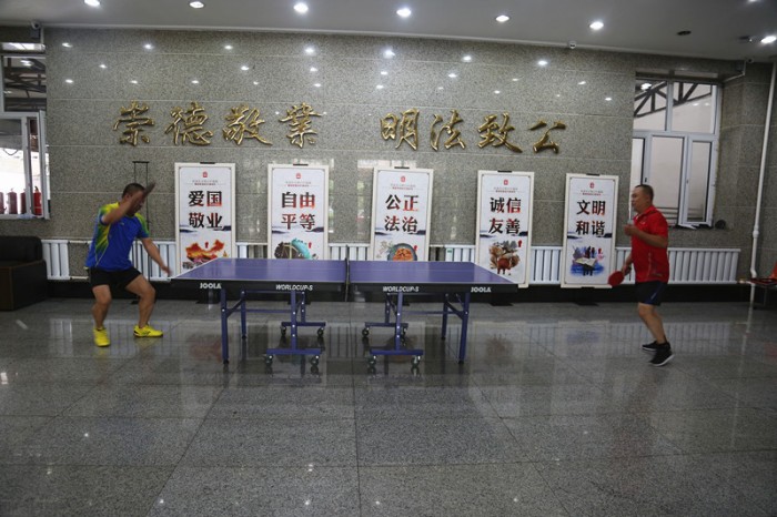 脱下了制服和法袍,摘下了警徽和警帽,赛场上,一身运动装扮亮相的法院干警们丝毫不减平日的风采,变换莫测的发球、精确到位的回拉、力道十足的扣杀,运动员们以一个接一个的精彩表现,引得观众们欢呼叫好声不断。