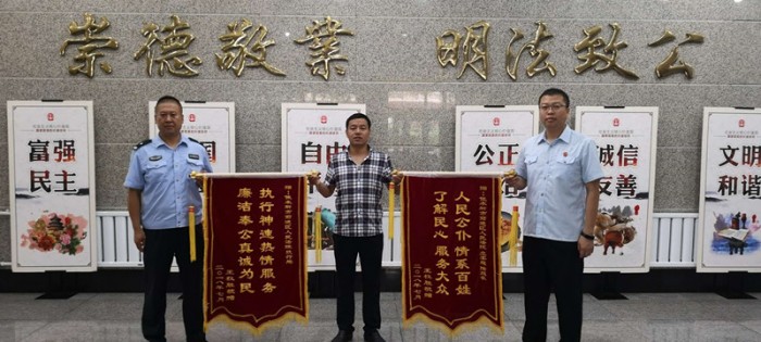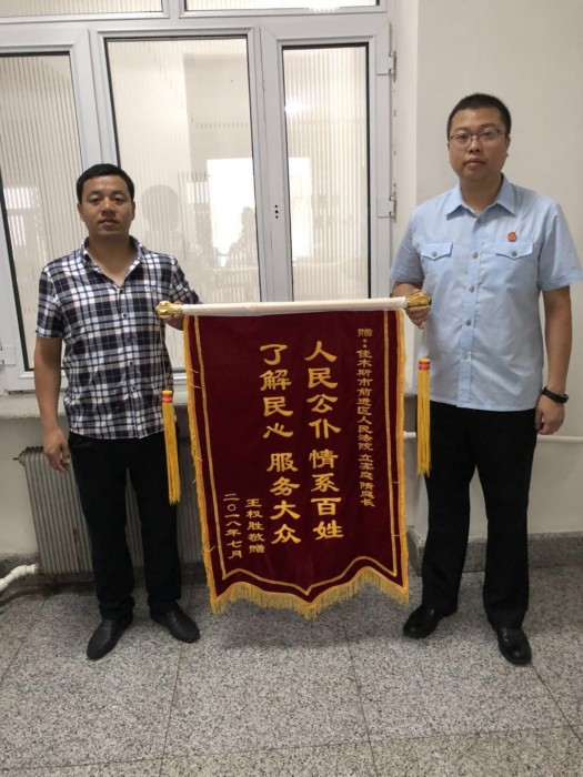 7月17日上午,当事人王某来到前进区人民法院,亲自将两面锦旗分别送到立案庭庭长隋德鸣,执行干警赵宝奎手中,高度赞扬法院高效立案了解民心,神速执行真诚为民。
