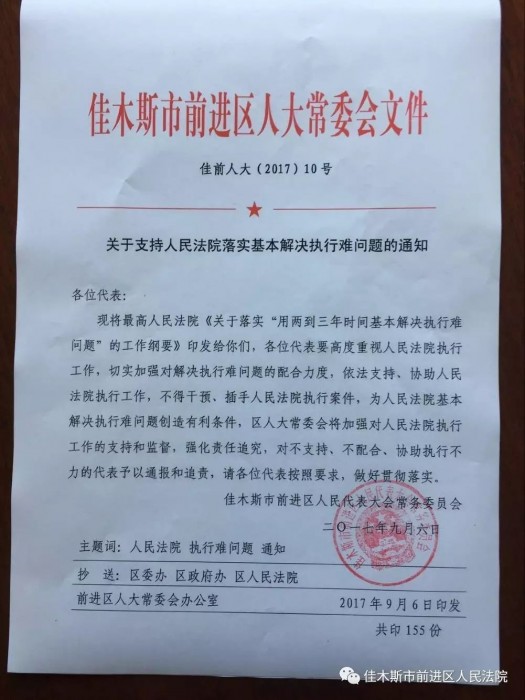 近日,中共前进区人大常委会、中共前进区委办公室、前进区人民政府分别印发《关于支持人民法院落实基本解决执行难问题的通知》(以下简称通知),就强化区属各单位及各界代表配合法院执行工作作出明确要求,为区法院坚持推进“基本解决执行难”、构建和谐有序法治环境提供有力政治支持。