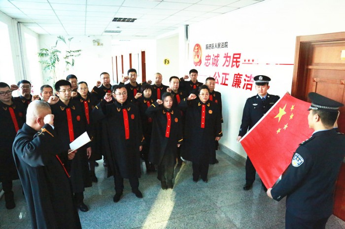 我宣誓:忠于中华人民共和国宪法,维护宪法权威,履行法定职责,忠于祖国、忠于人民,恪尽职守、廉洁奉公,接受人民监督,为建设富强民主文明和谐美丽的社会主义现代化强国努力奋斗!”12月4日,国家宪法日当天,前进区人民法院全体员额法官在院党组书记、院长张甲光的带领下,举起右拳,郑重宣誓,从内心深处感受到心灵的震撼,一种庄严、庄重的使命感和责任感油然而生。