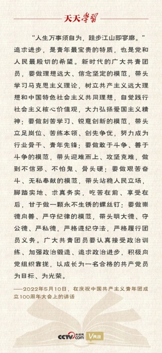 5月10日上午,庆祝中国共产主义青年团成立100周年大会在北京人民大会堂隆重举行,习近平总书记出席大会并发表重要讲话。在讲话中,总书记用古诗“人生万事须自为,跬步江山即寥廓”寄语新时代的广大共青团员,强调新时代的广大共青团员要做理想远大、信念坚定的模范,要做刻苦学习、锐意创新的模范,要做敢于斗争、善于斗争的模范,要做艰苦奋斗、无私奉献的模范,要做崇德向善、严守纪律的模范。